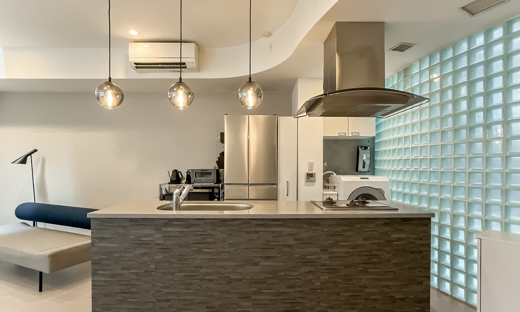 約27帖のゆとりあるLDKは北西向きながら、テラスに面した大きな開口部から光と風がしっかりと届く開放的な空間です。白とグレーを基調とした落ち着いた内装に、コンクリート打ち放しの柱やガラスブロックが程よいリズムを与え、洗練された表情を演出しています。