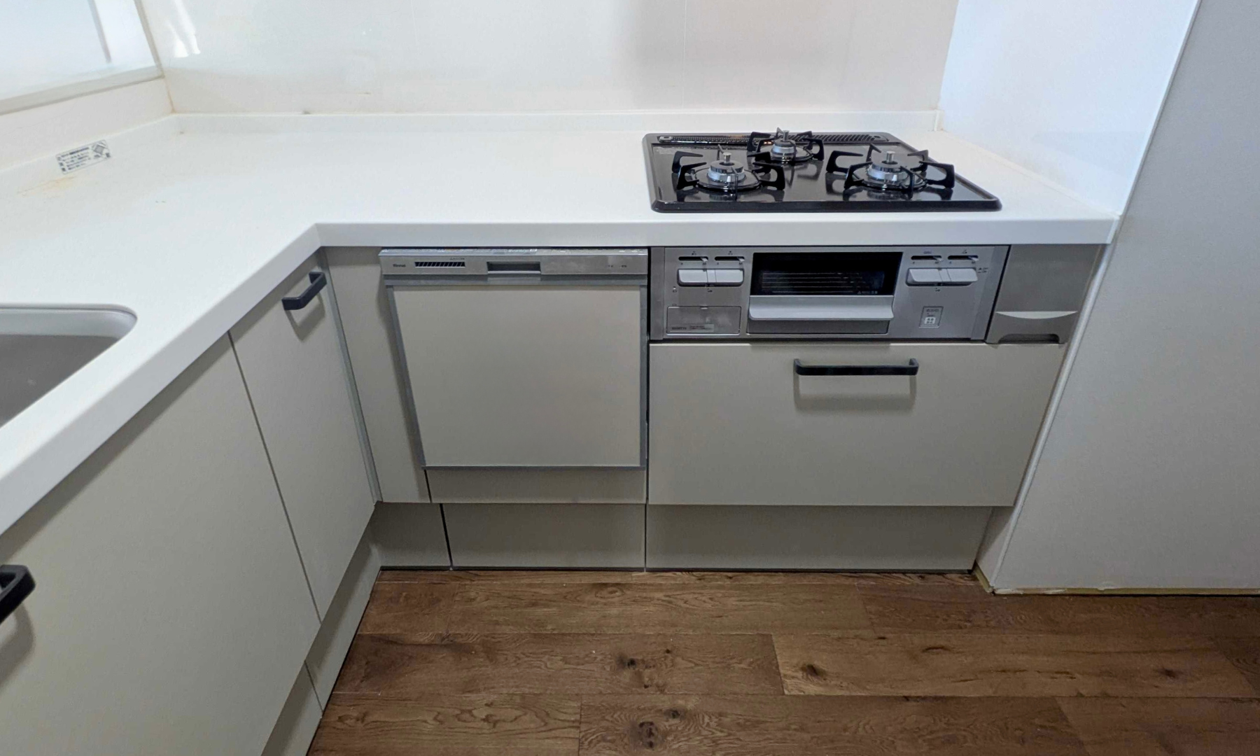 L型キッチンにリノベーションされ、Panasonic製の食器洗い乾燥機や三口ガスコンロを備え、毎日の料理がスムーズに進みます。回遊動線が確保されており、家族の様子を感じながら作業できるキッチンです。
